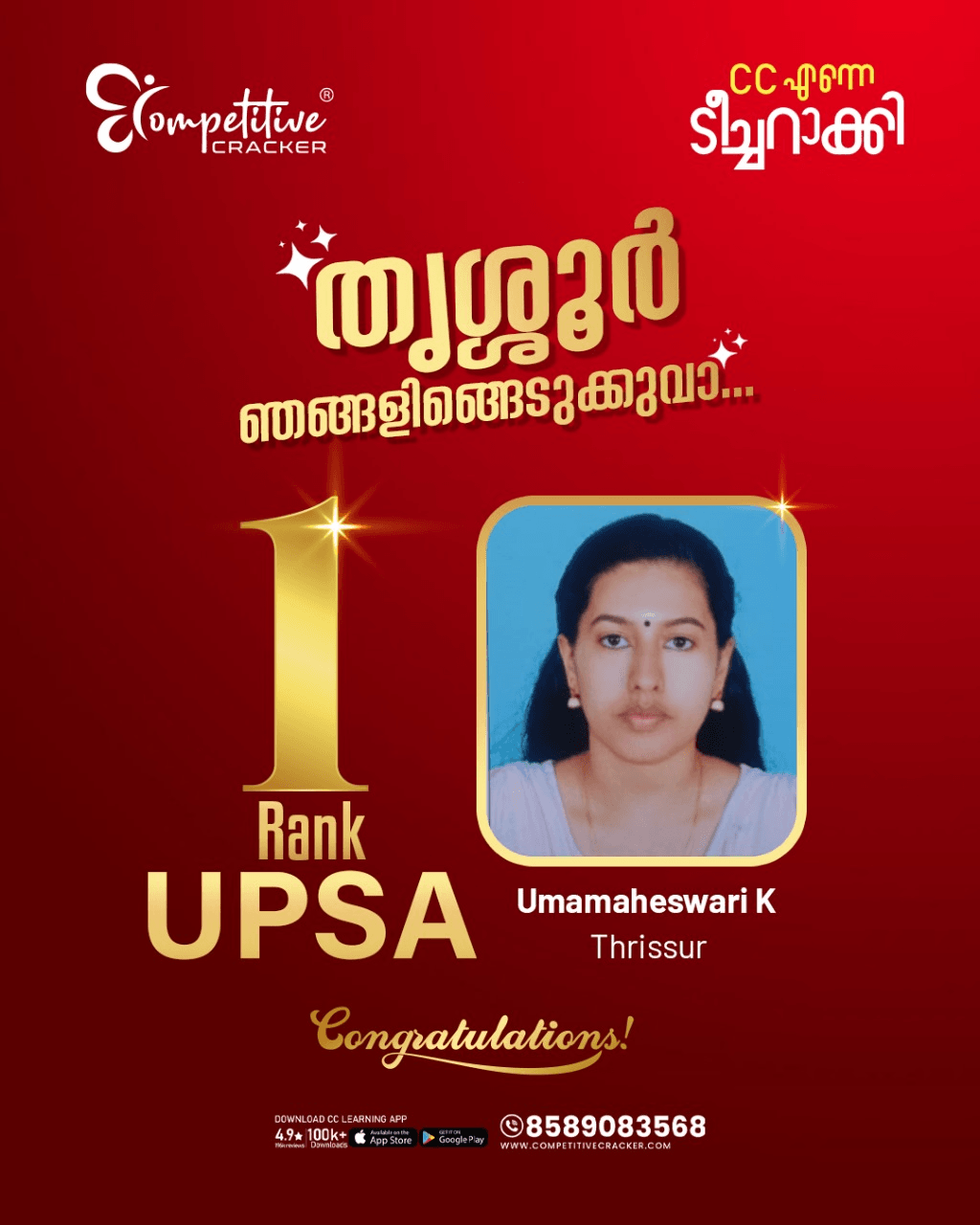 We are proud to share that CC Learning App students have secured top ranks in the Kerala PSC UPSA Results 2025 (Category Number 707/2023). Our student Umamaheswari K achieved 1st rank in the Kerala PSC UPSA Results 2025 for Thrissur district, along with many other CC Learning App students who earned top positions across multiple districts in Kerala.