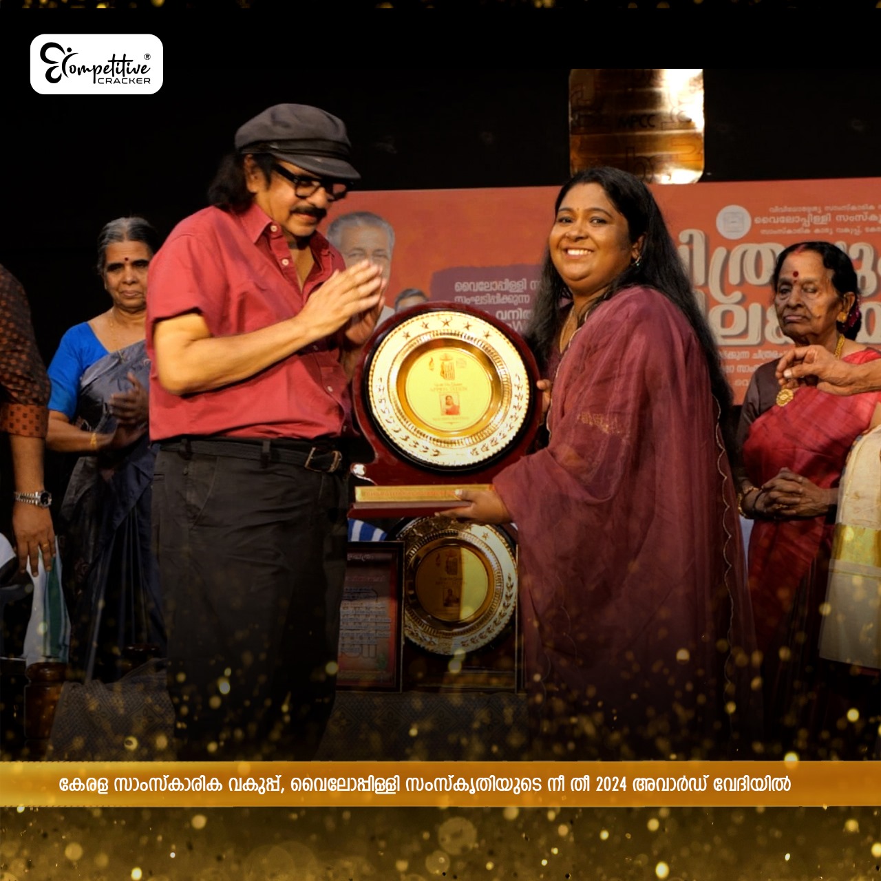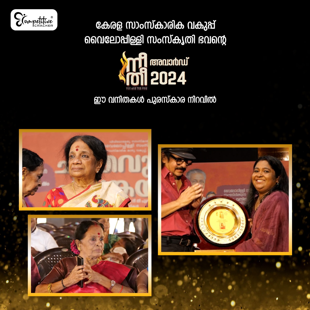 In addition to the usual celebration the 2024 Women’s Day is special for Competitive Cracker. For the past few years, the cultural department of Kerala State convenes the നീതീ award ceremony under Vyloppilli Samskriti Bhavan. The award is bestowed upon to honor the strong female figures from various fields. And the ceremony is a sound statement that the cultural and intellectual awakening of a region is measured through the upliftment of women community of the region. Many women of eminence who are noted for their contributions to the society and women community through various forms of expressions and actions were honored in previous years. This year the award is received by Vimala Menon, the renowned Mohiniyattam exponent and the founder director of Kerala Natya Academy, Thiruvananthapuram, and K Omanakutty the famous musician. Along with these eminent personalities Mrs. Asha Bineesh received the prestigious award from the Soorya Krishnamoorthy the renowned Indian artist.