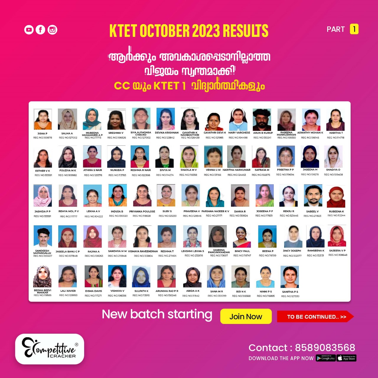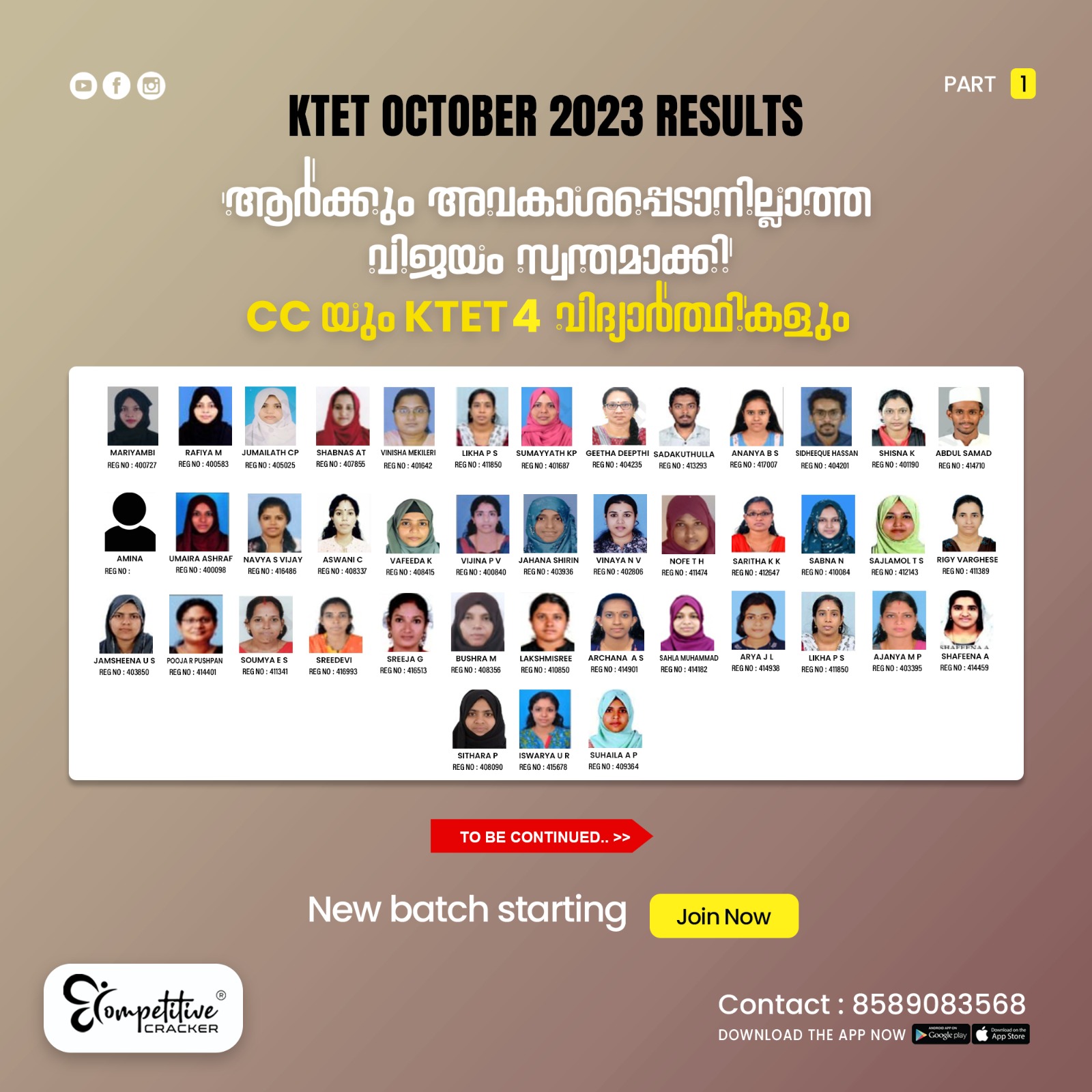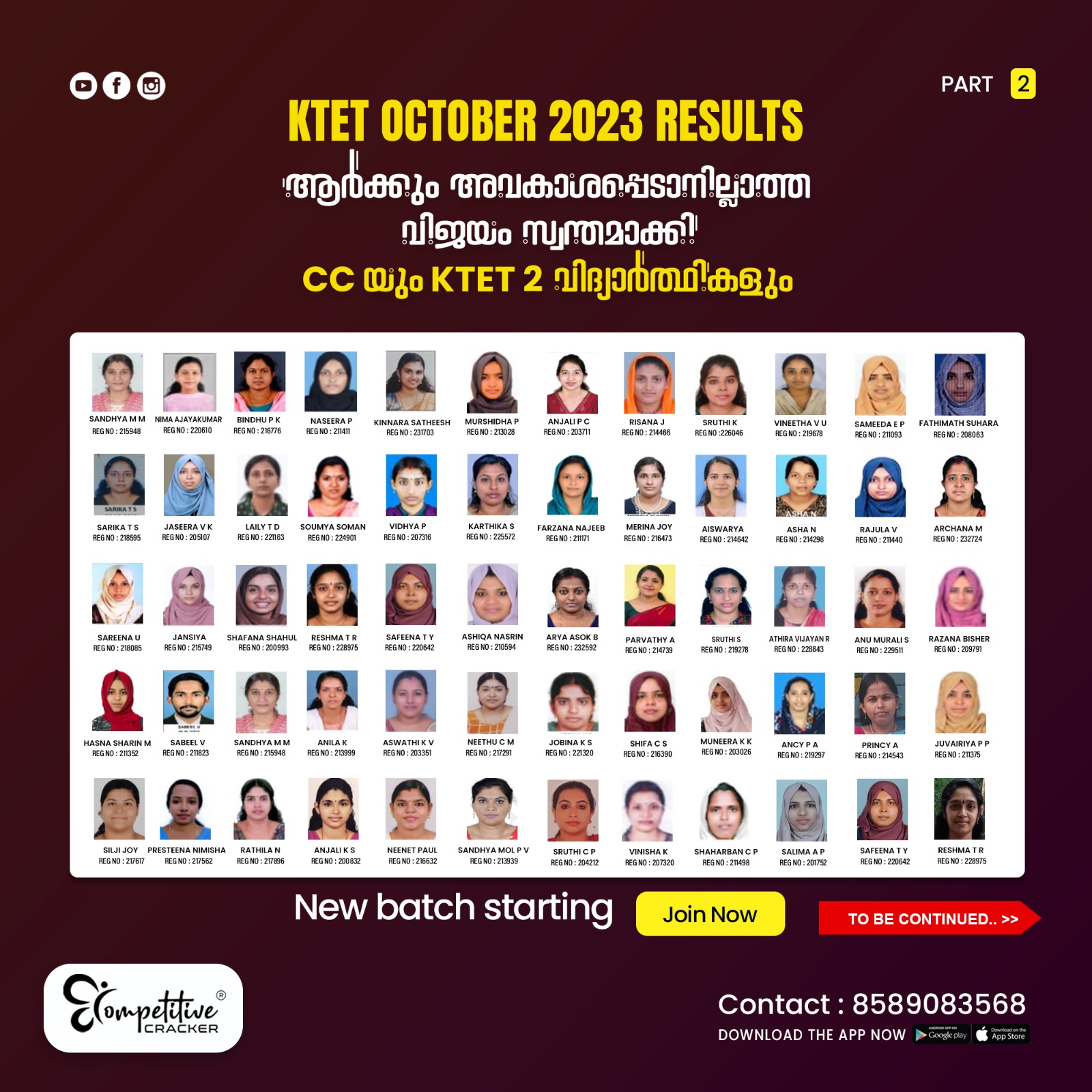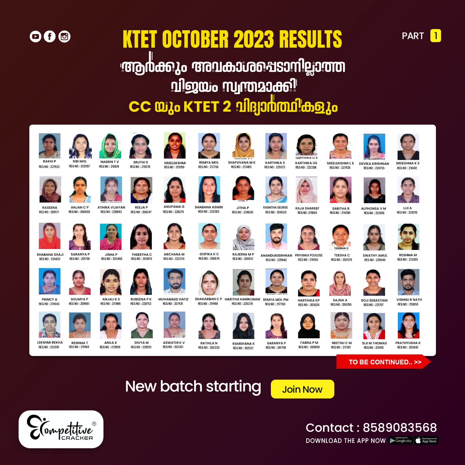 Competitive Cracker has recorded the highest number of candidates clearing KTET in KTET exam 2023 December edition. Competitive Cracker has registered a gleaming victory of 80% candidates trained by us in various batches and categories.