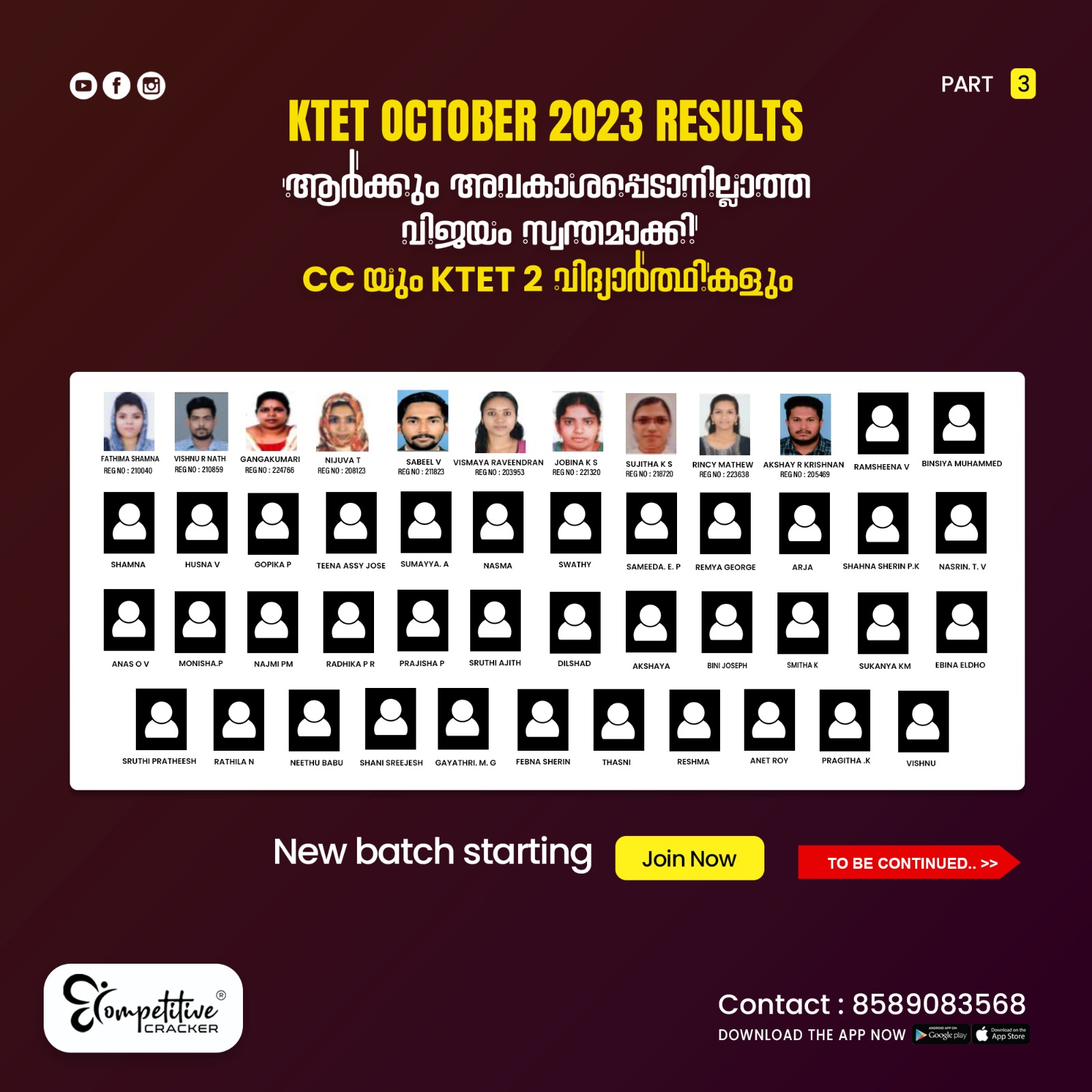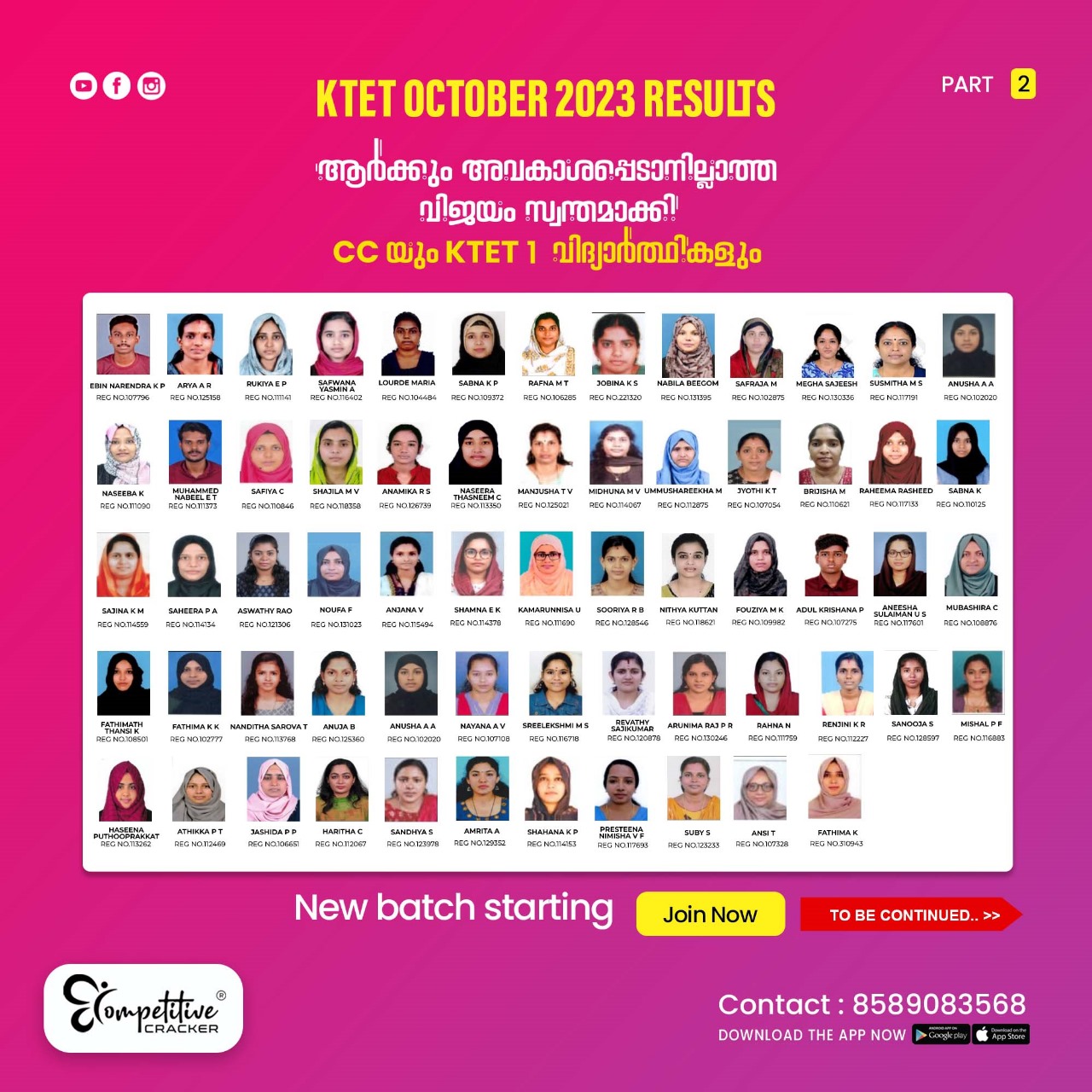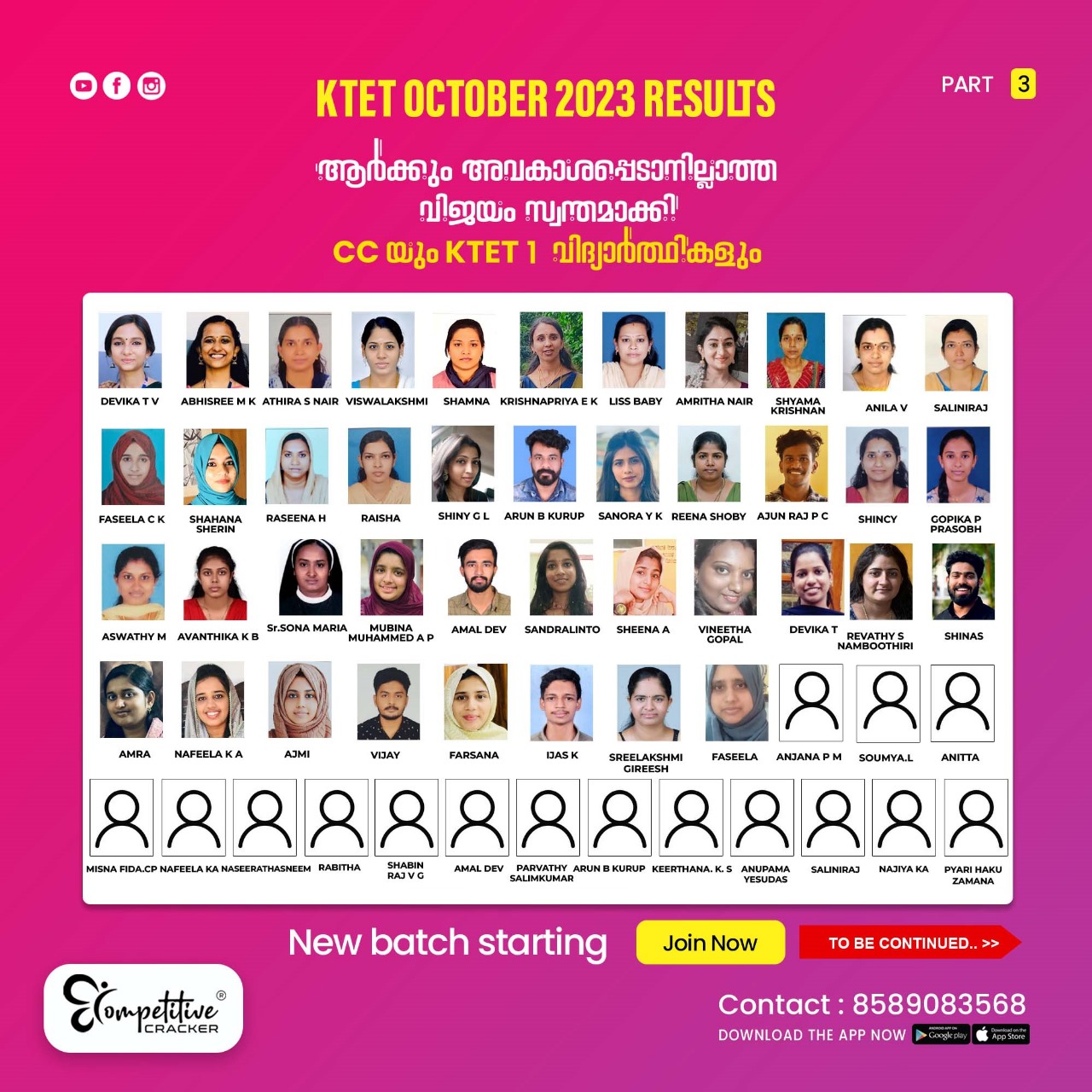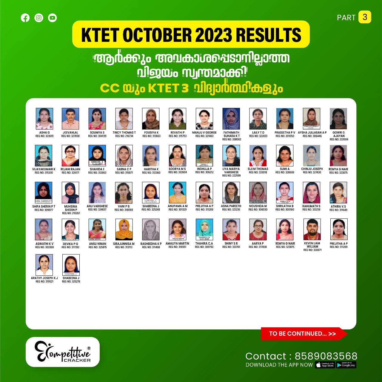 Competitive Cracker has recorded the highest number of candidates clearing KTET in KTET exam 2023 December edition. Competitive Cracker has registered a gleaming victory of 80% candidates trained by us in various batches and categories.