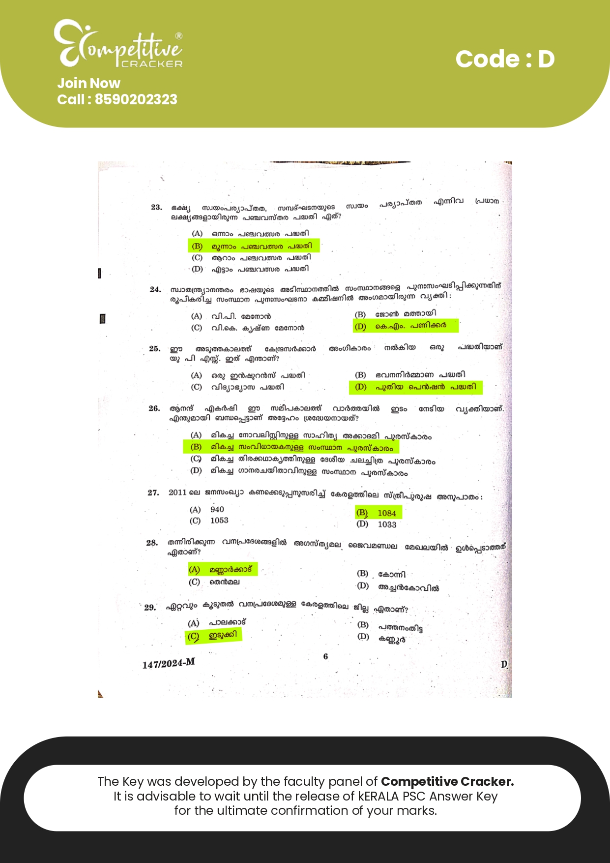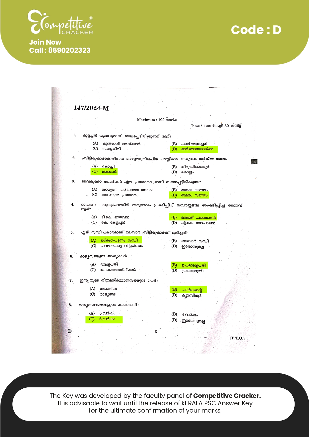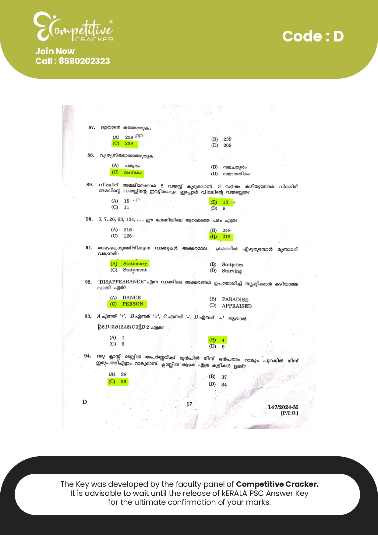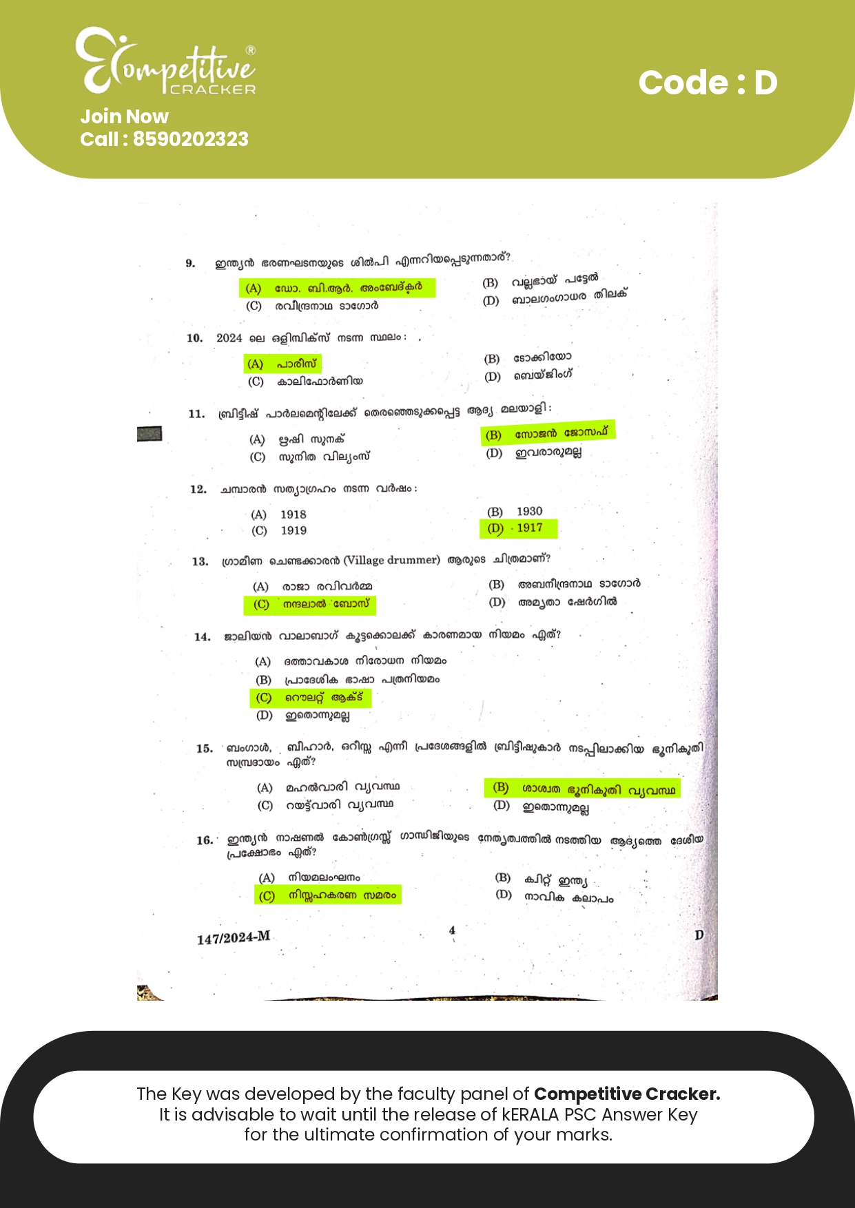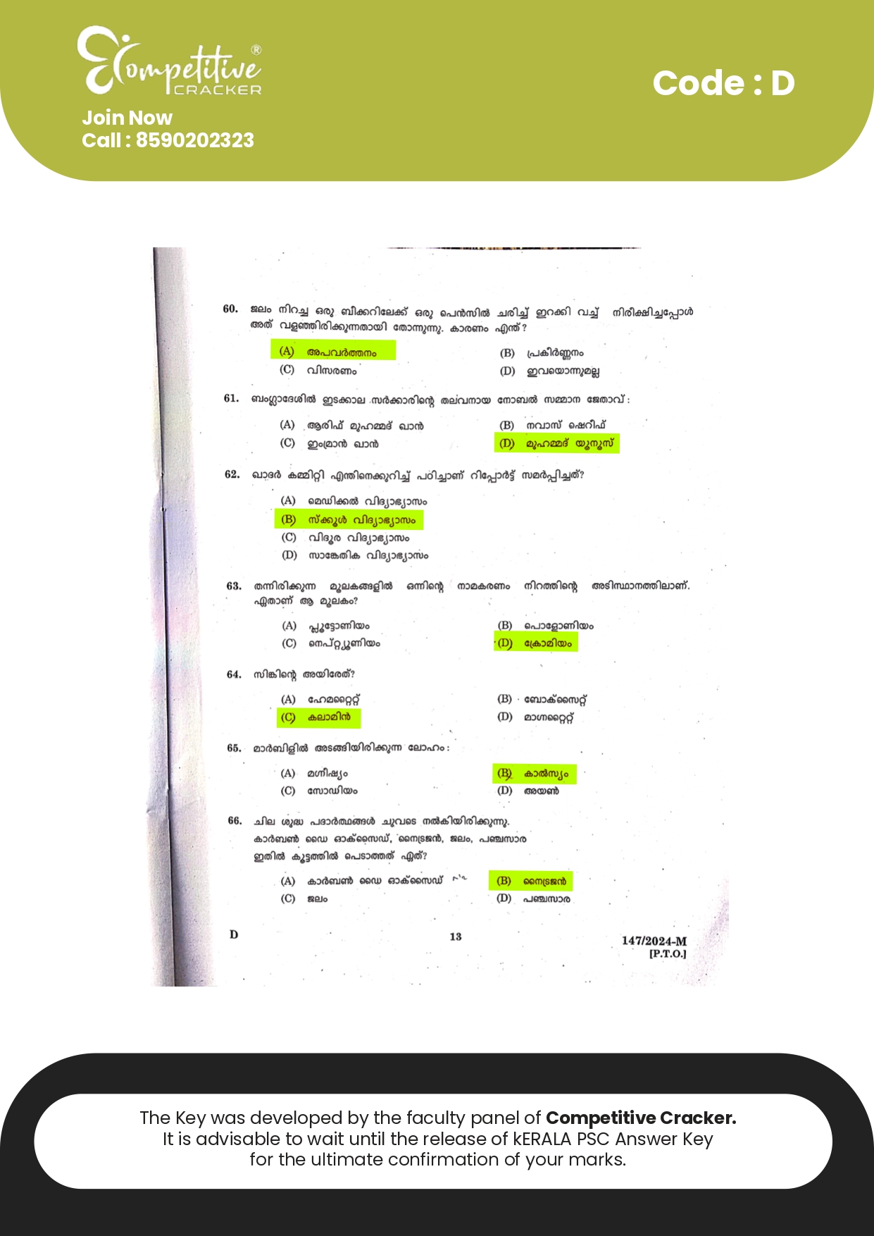 Go through the solved question paper below. Compare the answer key with the answers you have marked. The official PSC Kerala Bank provisional answer key will be available on the website soon.