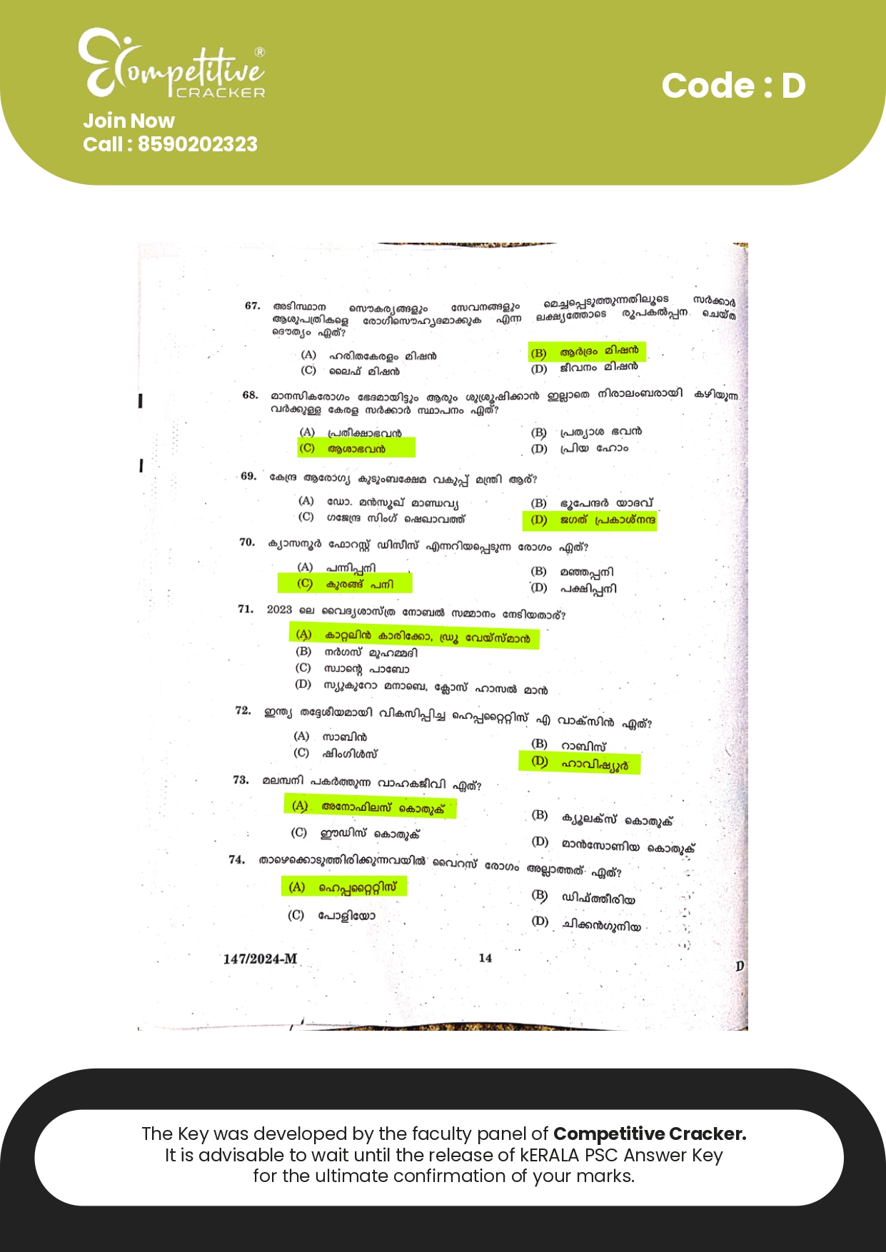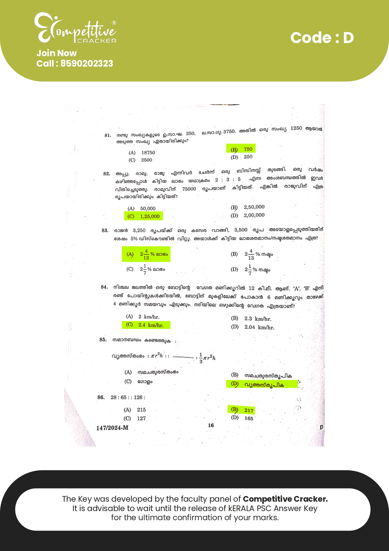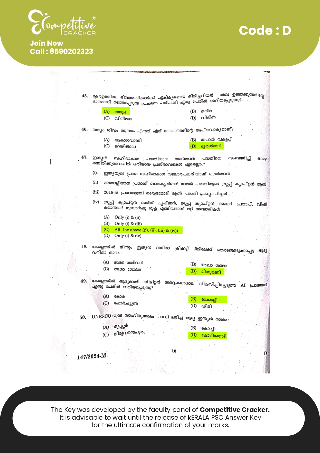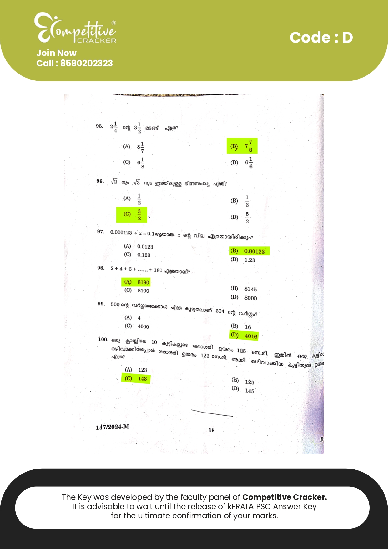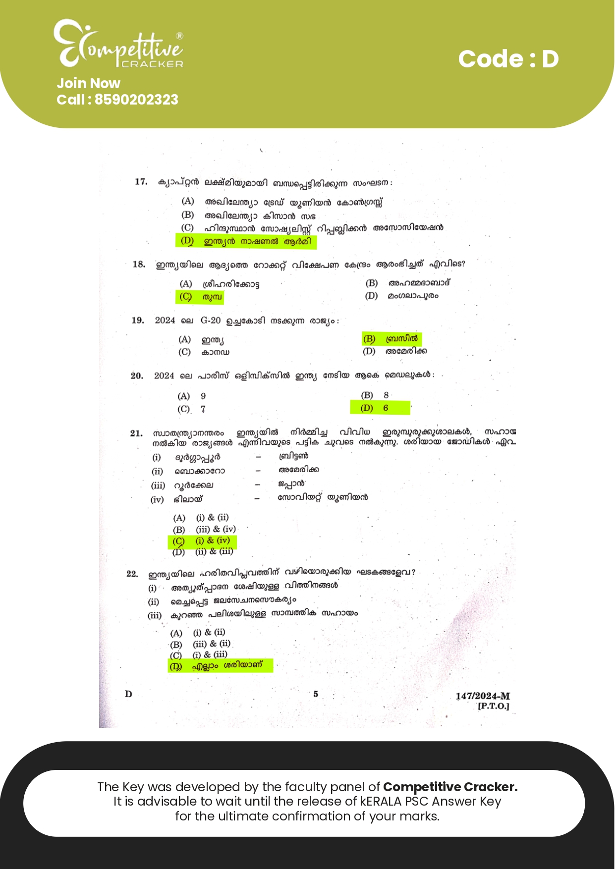 Go through the solved question paper below. Compare the answer key with the answers you have marked. The official PSC Kerala Bank provisional answer key will be available on the website soon.