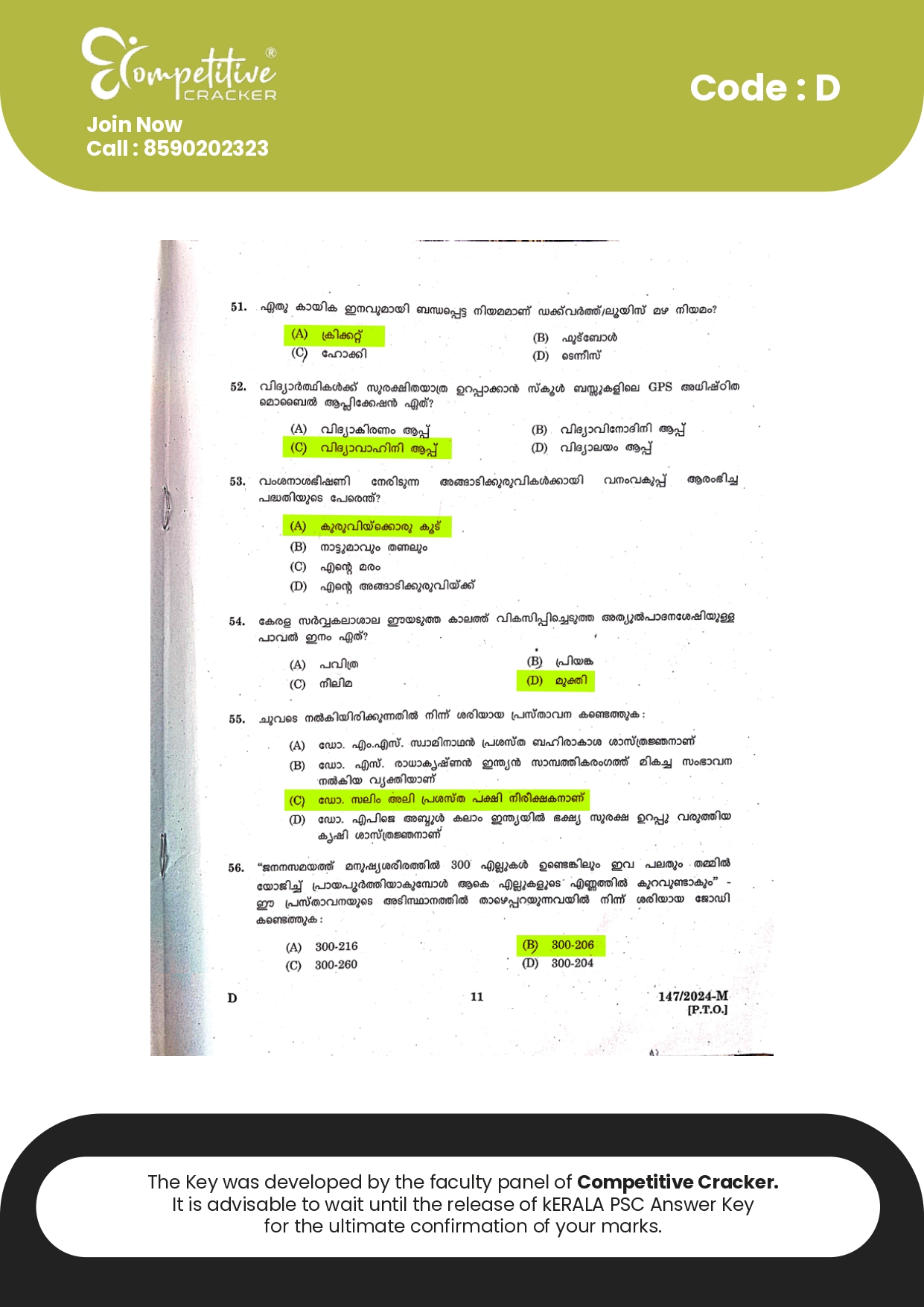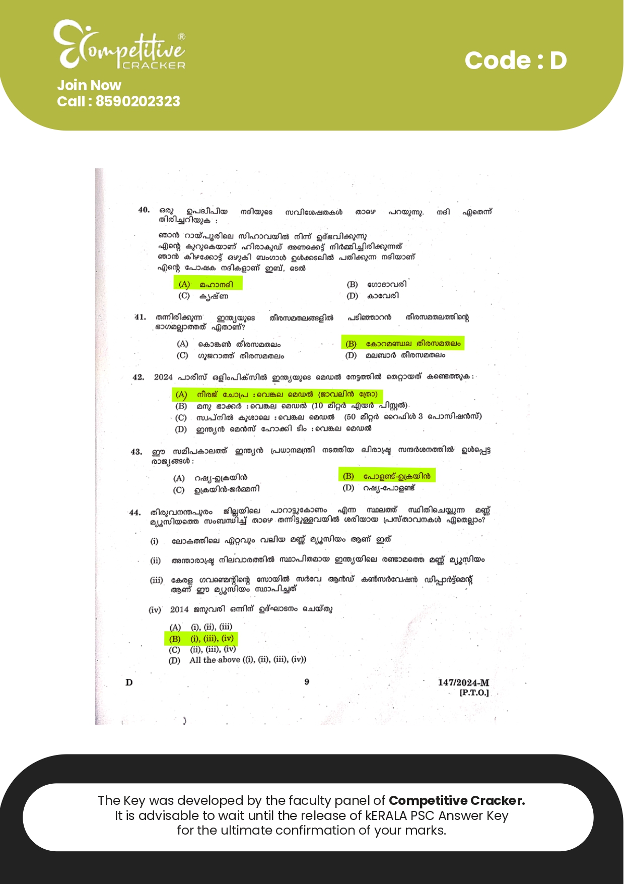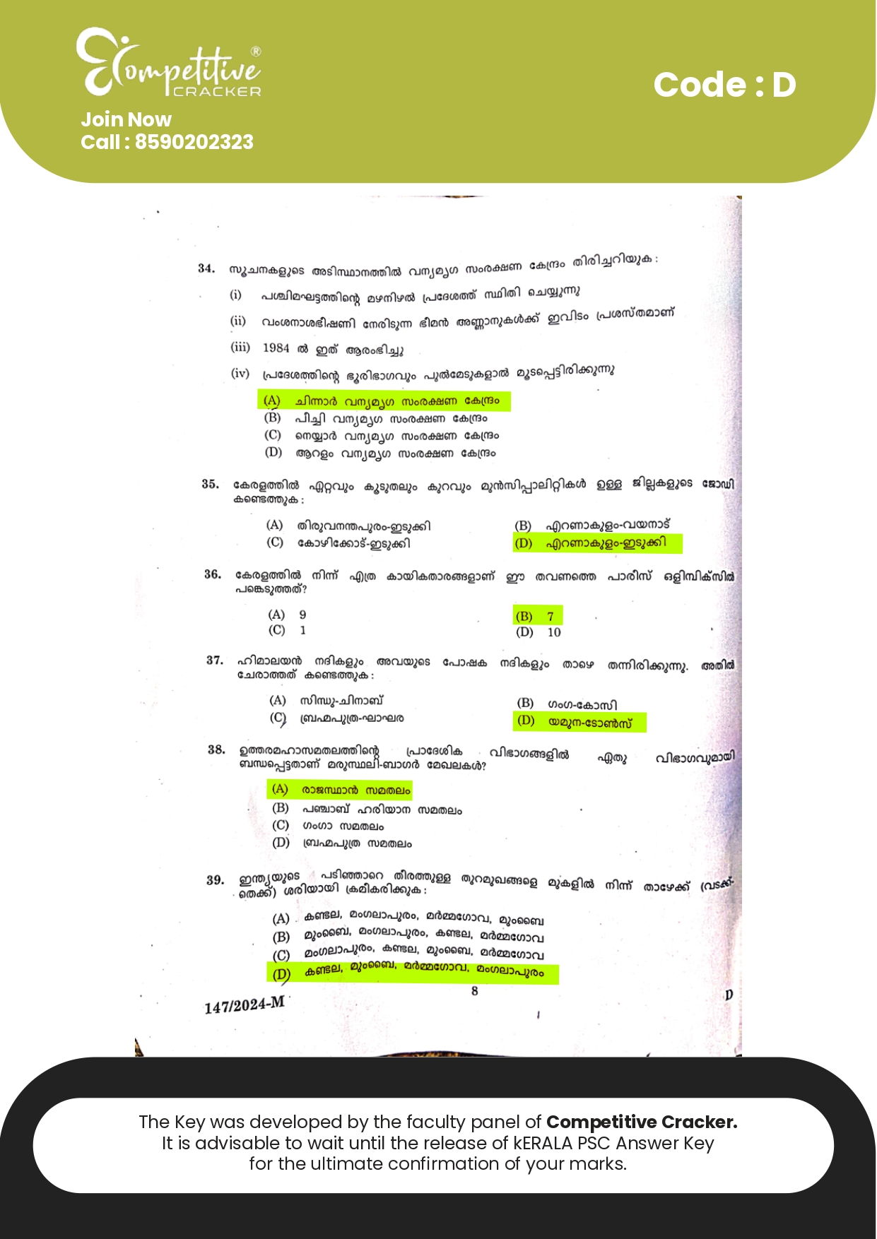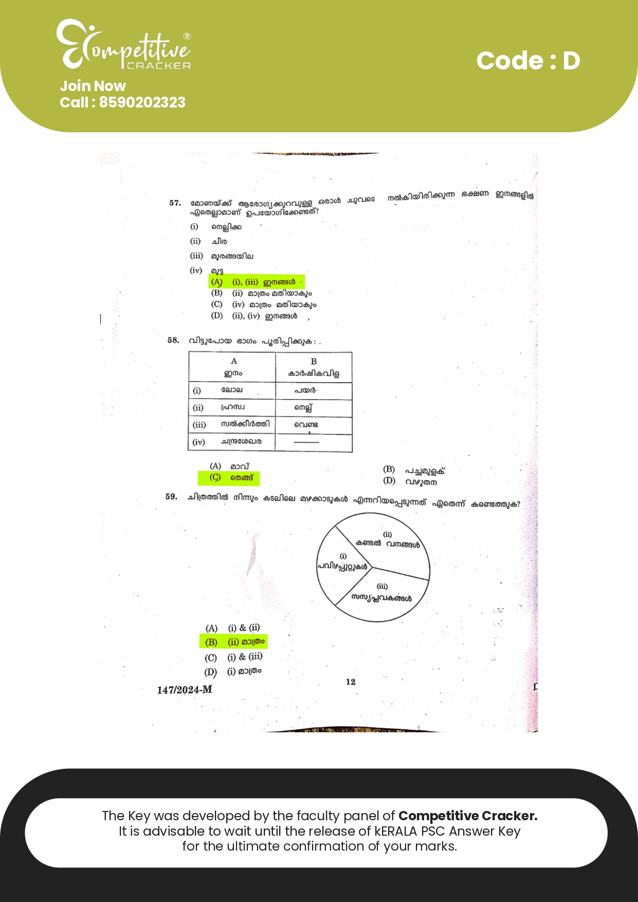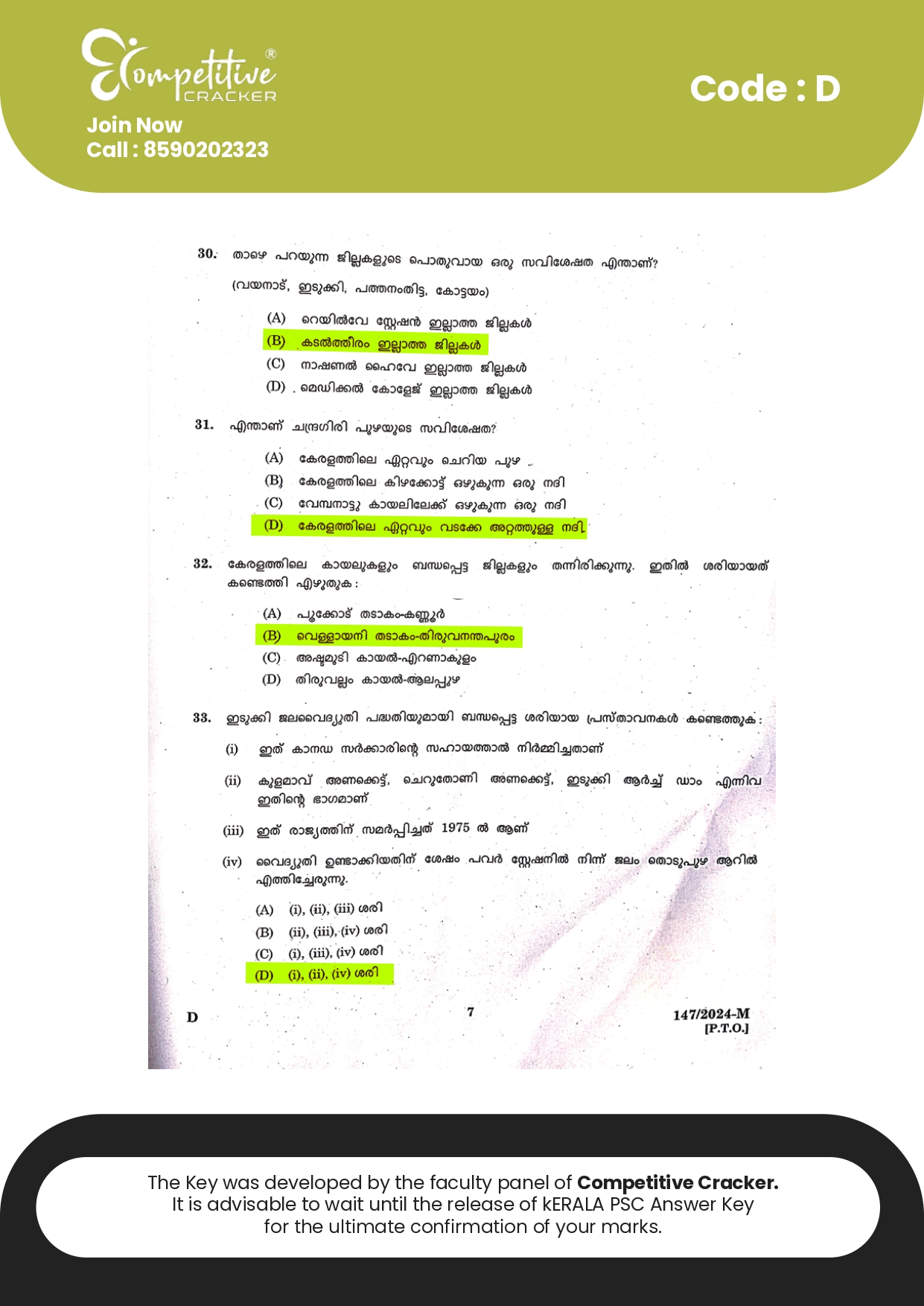 Go through the solved question paper below. Compare the answer key with the answers you have marked. The official PSC Kerala Bank provisional answer key will be available on the website soon.