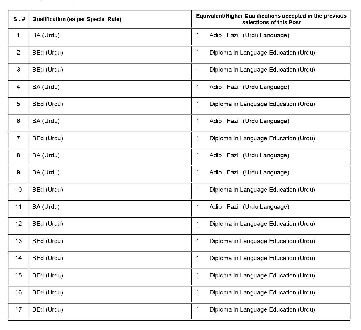 A Degree in Urdu and B.Ed/B.T/L.T conferred or recognized by the universities in Kerala.