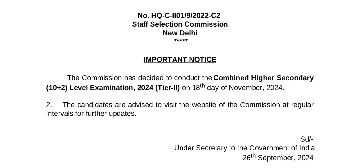 SSC CHSL Tier II Official Exam Date 2024 is 18 November, 2024. Candidates preparing for the upcoming exam programme should be mindful about this date while designing their time table. Practice on as many exercises and ensure a hassle-free exam appearance. Find the official notice from the site of Staff Selection Commission confirming the date of CHSL Tier II exam.
