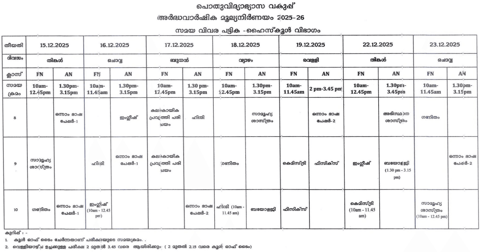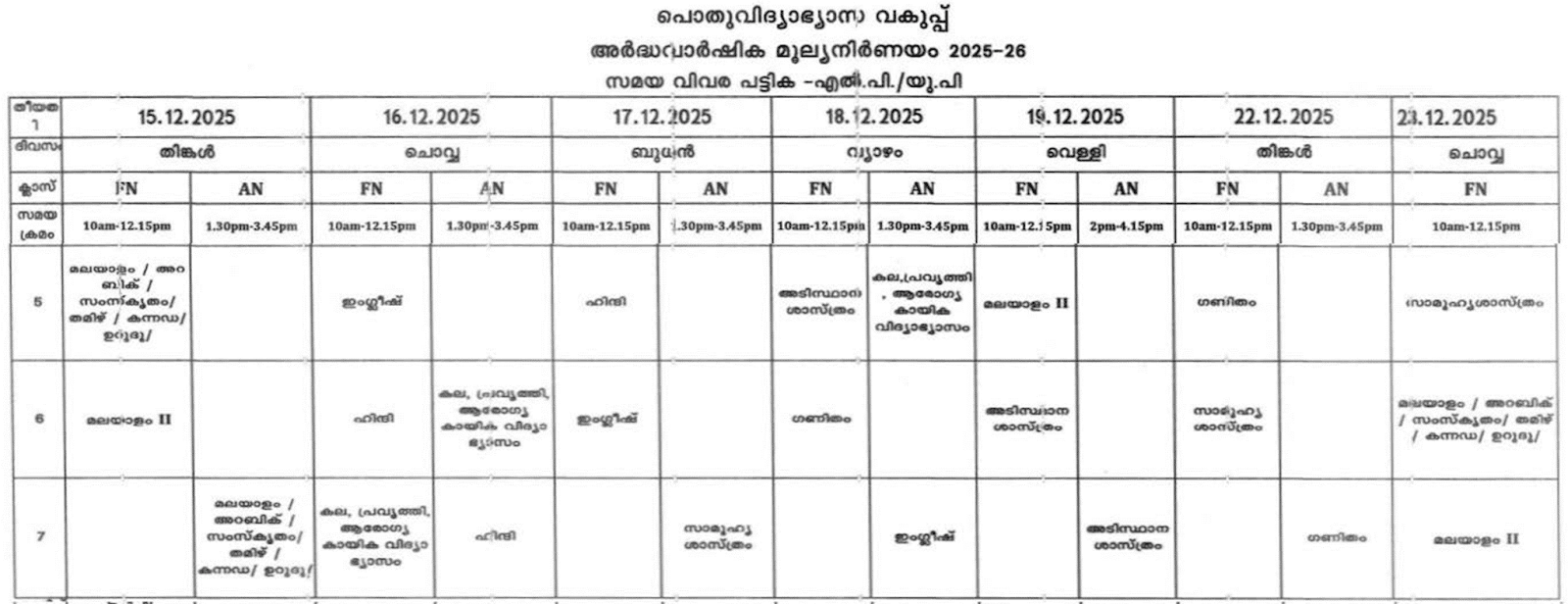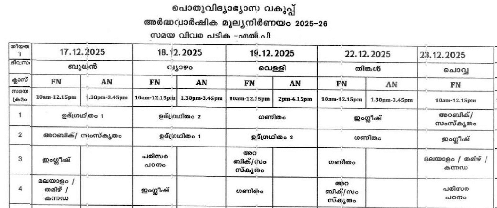 The Kerala Educational Department has released the Kerala Second Terminal Exam Time Table 2025 for Classes 1 to 10. The Second Terminal (Christmas) Exam 2025 will be held across all schools from 15 December 2025 to 23 December 2025. The Christmas holidays start on 24 December 2025 and schools will reopen on 5 January 2026. Scroll down for the class timetables for LP, UP, HS, Plus One and Plus Two.